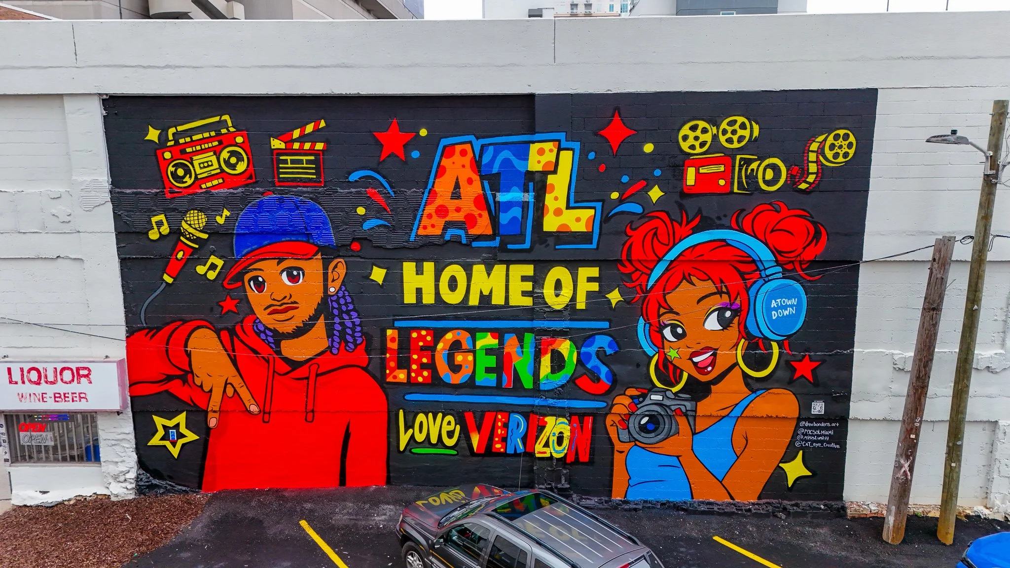 Created as part of Verizon’s Project Love Letter, the Baker Street mural celebrates Atlanta as a cultural powerhouse where music, film, art, and storytelling intersect. The composition brings together symbols of sound and cinema alongside two central characters, representing the creative energy that has shaped Atlanta’s global influence.