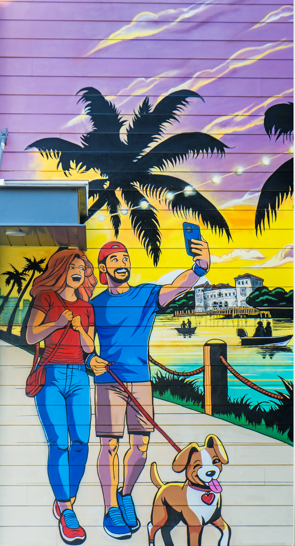 Set against a colorful waterfront sunset inspired by the Vizcaya Museum and Gardens, the mural captures everyday moments of connection, exploration, and joy while celebrating the Grove’s rich culture and scenic beauty. It features a couple capturing the moment as they walk their dog, highlighting the beauty of everyday life and shared experiences. The piece reflects Verizon’s intention to create a true love letter to the neighborhood by capturing how Coconut Grove residents live, interact, and experience their environment.
